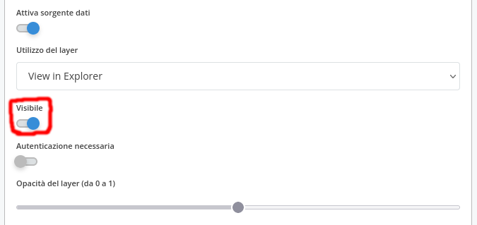 - All'interno della configurazione del datasource per le mappe è ora possibile specificare se il layer è visibile oppure no all'apertura della mappa: