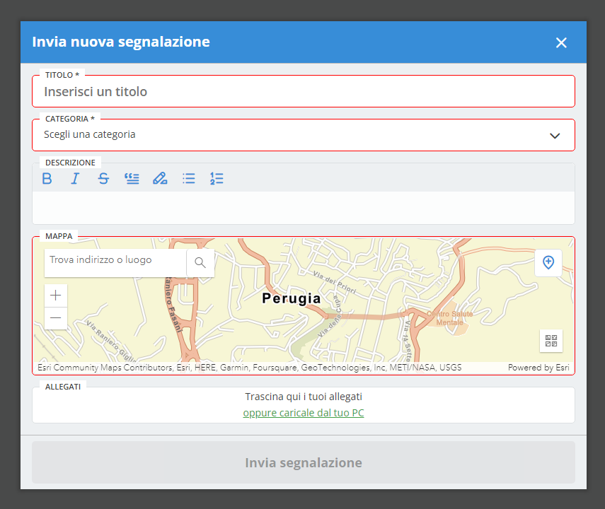 - La modale di invio segnalazione per il cittadino adesso richiede titolo, categoria e posizione in mappa per poter essere inviata. I campi provenienti da moduli esterni (mappa inclusa) sono configurabili all'interno della categoria. Ora la creazione della nuova segnalazione, con tutti i campi, è stata ridotta ad un solo passaggio tramite la seguente schermata: