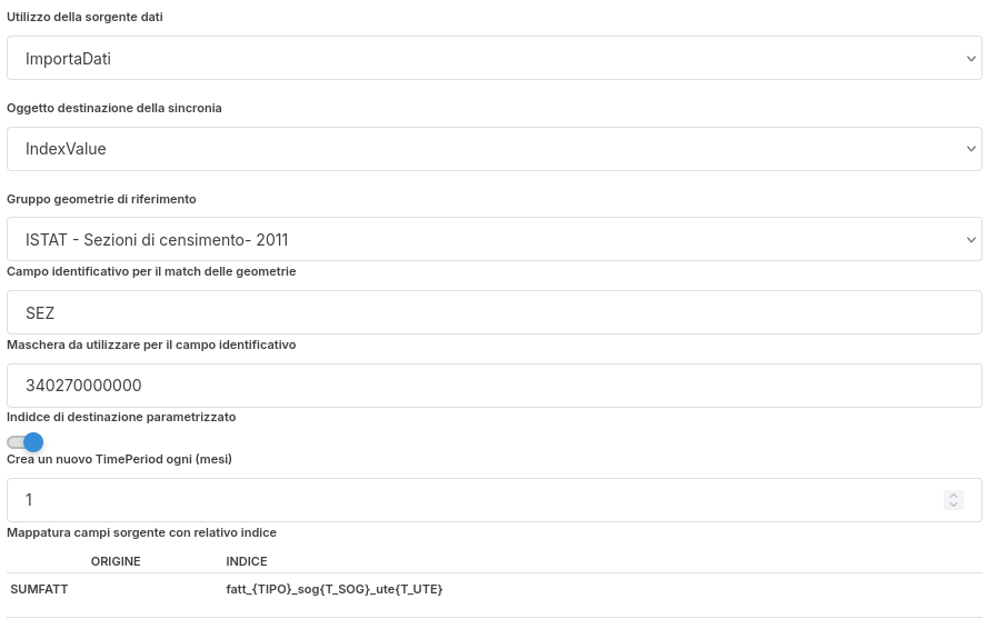 - Tabella di mappatura campi: indicare l`abbinamento tra l'attributo della sorgente e il relativo indice da valorizzare. In caso