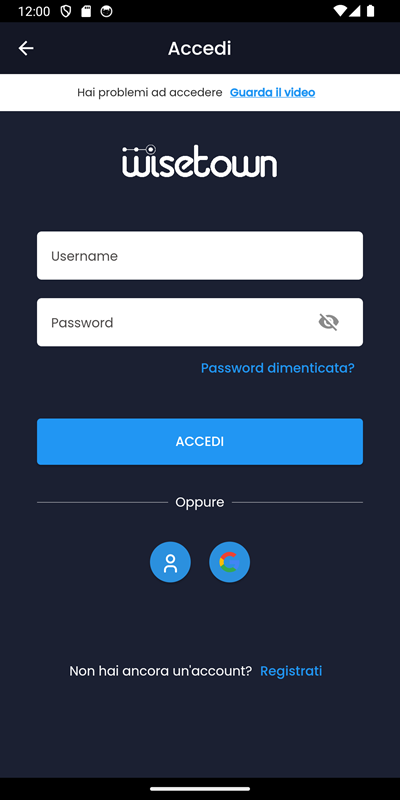 - Come sulla versione web la pagina di login mostrerà soltanto i metodi abilitati per il workspace pubblico selezionato, se il workspace non è configurato con alcun metodo non sarà mostrato alcun metodo di login.