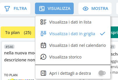 - E' stata aggiunta una visualizzazione che permette di aprire le modali sempre a destra. In questo modo è possibile lavorare più velocemente sui task senza dover ricaricare la modale ogni volta.