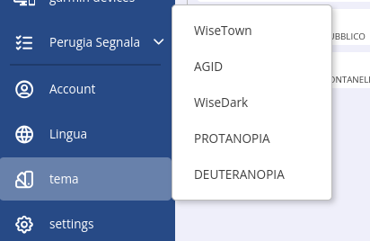 - Aggiunta la possibilità di cambiare tema: tema default WiseTown (chiaro), tema AGID (chiaro), tema WiseDark (scuro), tema protanopia (chiaro), tema deuteranopia (chiaro)