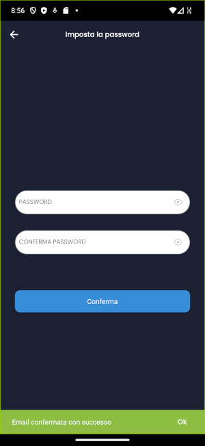 - Dopo aver inserito il codice inviato tramite email ed aver confermato la mail, aggiungere una password.